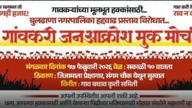 बुलढाणा शहर हद्दवाढीला सागवण ग्रामस्थांचा विरोध; आज जिल्हाधिकारी कार्यालयावर जनआक्रोश मोर्चा.. बुलढाणा : सागवण येथील ग्रामस्थांनी बुलढाणा शहर हद्दवाढीच्या प्रस्तावाला तीव्र…