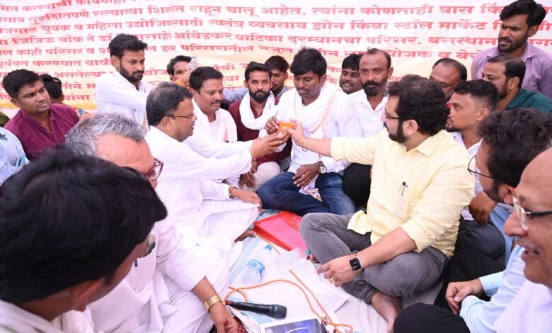 मेहकरातील व्यावसायिकांचे साखळी उपोषण खा.डॉ. अमोल कोल्हे यांणी उपोषण करते किशोर गारोळे यांना ज्यूस पाजून उपोषणा सोडले….