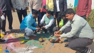 रांगोळींनी सजवत फुले वाहून खड्ड्यांचे पूजन!….वंचित युवा आघाडीचे अनोखे आंदोलन